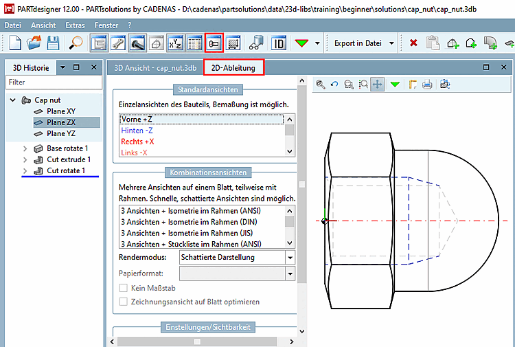 In the 3D history [3D History] docking window, use the secondary mouse button to call up the context menu of the plan in which the sketch was created that is to serve as the basis for the dimensioning view.