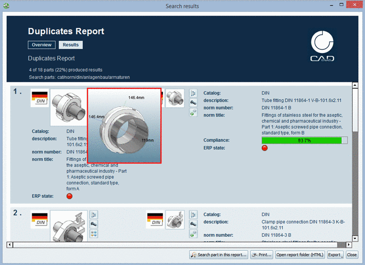 At parts, which are found via Geometric search (3D) and are transferred into the Part comparison, there, in the Tabular Compare section the geometric similarity is overtaken and displayed as well.[74]