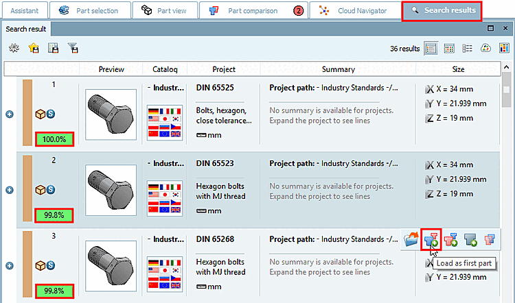 For parts that are found via Geometric search (3D) and transferred to the part comparison [Part comparison], the geometric similarity is also transferred and displayed in the Tabular comparison [Tabular Compare] dialog area.[45]