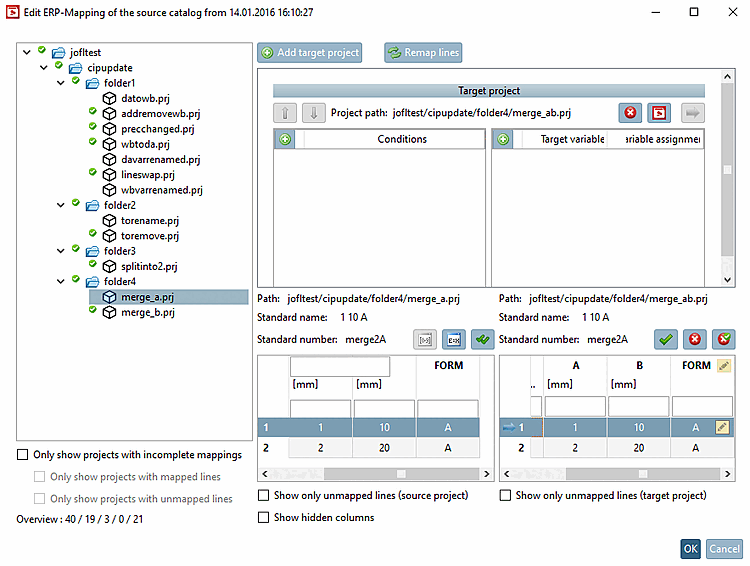 The software attempts to map the source projects (of the selected published catalog version) to the target projects (of the local working copy). If a release mapping already exists and files have been changed since the last time, the mapping is created. If the mapping has already been verified (in the Edit ERP mapping for the source catalog from ... dialog) and the table version has not changed, the mapping is retained. Mappings that have not been verified are overwritten. Mappings with new changes are added.