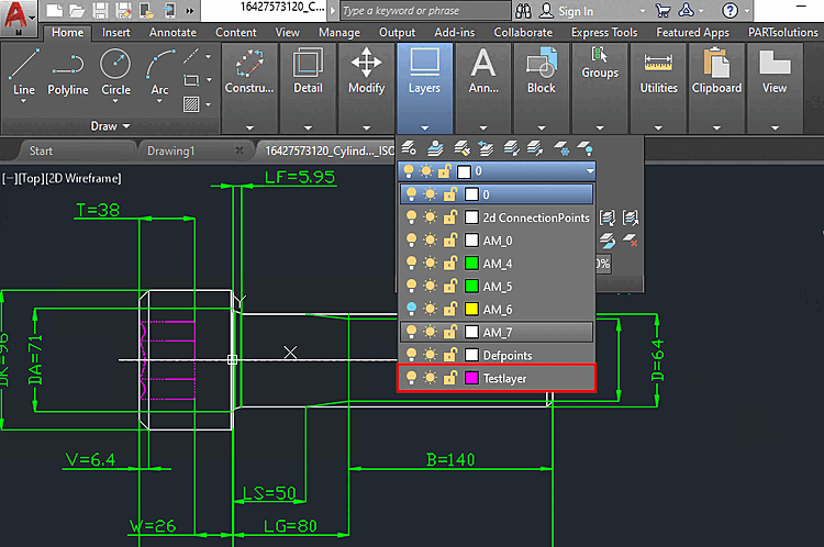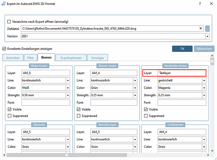 In this example, the layer name under Hidden lines [Hidden Lines] is set to "Test layer".