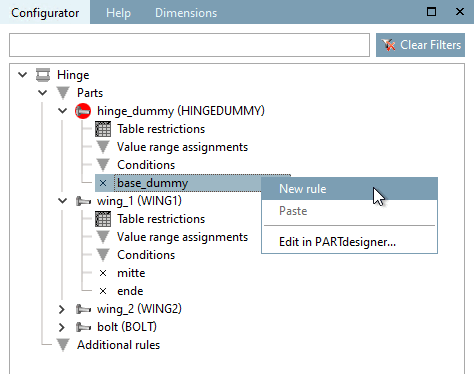 -> The relation between "base_dummy" and connection point "wing1" is signalized by a red arrow line.