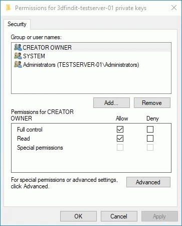 In this example the server has a hostname „testserver-01“ and we will use „3dfindit-testserver-01“ as a friendly name. For a friendly name you can add anything you want or use something a bit descriptive so that you can easily find your certificate if there are more of them for the same host. The local server user is „root“.