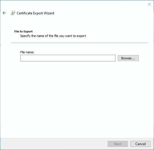 Select the location and a name for the exported certificate and select and select (In this example the location will be the C:\ drive and the name of the file will be certificate ).