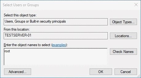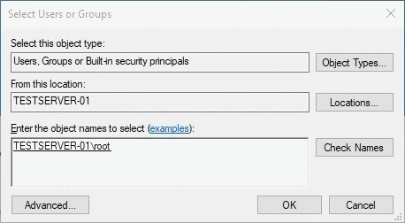 We should get an output in the Enter the object names to select box in the format „HOSTNAME\username“ as in this example „TESTSERVER-01\root“ after you have selected .