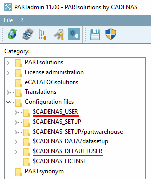 When selecting the category $CADENAS_DEFAULTUSER category, the same configuration files are displayed as under $CADENAS_USER. The purpose of the double listing is that, regardless of the default settings under $CADENAS_DEFAULTUSER personal settings can be set under $CADENAS_USER can be set.