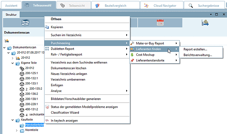 For example, " Make-or-Buy Report " can be found [Find suppliers] in the own parts folder [My parts], and " Suppliers" can be found [Find suppliers] in the manufacturer parts folder [Supplier parts], e.g.