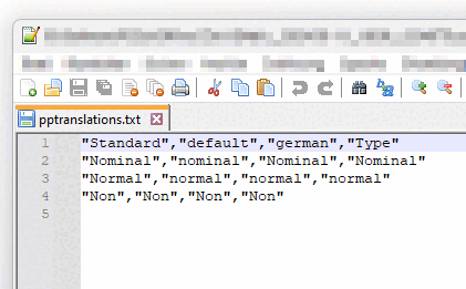 The first line must not be changed or deleted. It consists of the catalog languages and should contain the values "Standard", "default" and "Type" as shown in the figure above. The "german" is a representative example of the supported catalog languages. All supported languages must be listed. The respective value must be in quotation marks, separated by a comma and no spaces may be used.
