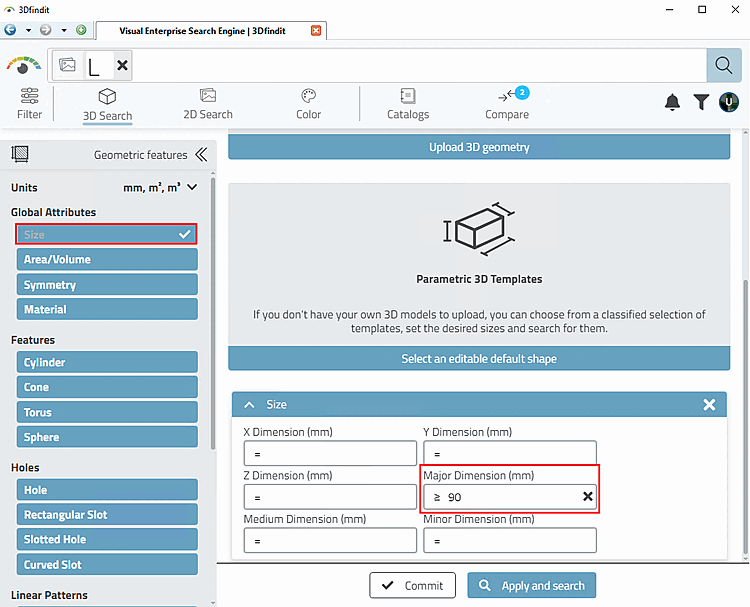 Select Size and enter >= 90 under Largest dimension [Major Dimension].