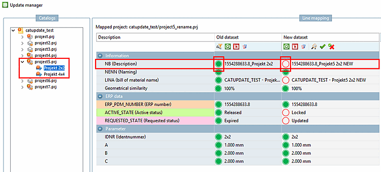 If the standard designation has been changed for a project, all project lines, the project itself and the higher-level directories are marked with the orange exclamation mark is displayed. The exclamation mark overlays the respective basic symbol (directory , project line ).
