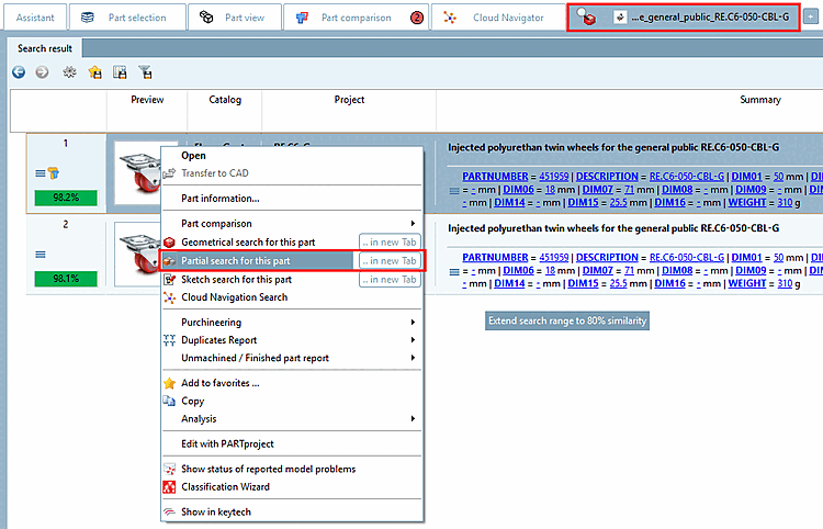You can start a partial search [Partial search] using the context menu command Search partial search for this part [Partial search for this part] for this part of each result part. It is then also listed under History.