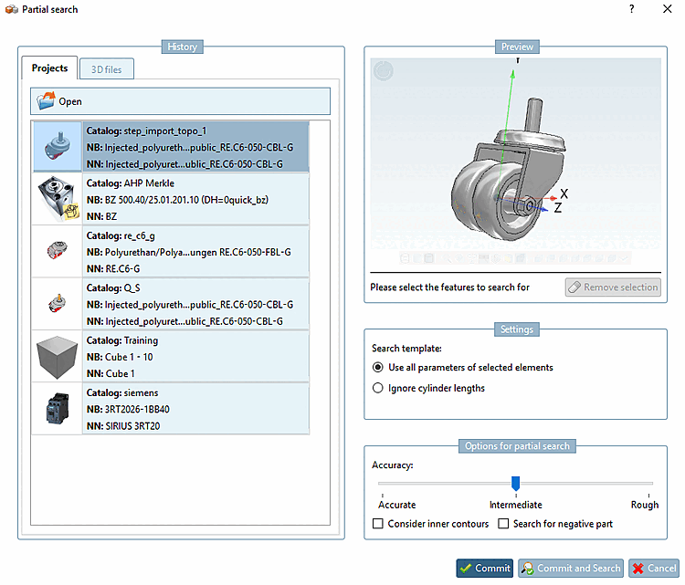 You can also find the Partial search for this part context menu command in the part view [Part view] in the References [Links] dialog area.