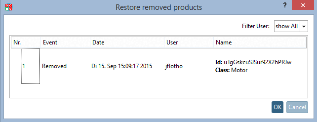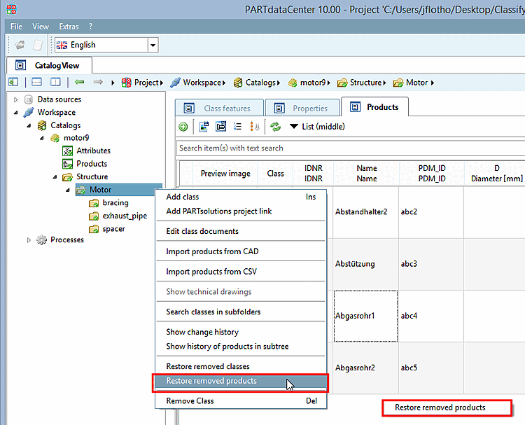 3. To restore the removed product, call up the context menu command Restore removed products anywhere in the Products dialog area or on the corresponding class in the tree.