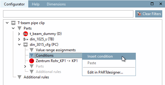 For the "Pipe clamp" (RS) component, click on the context menu command Insert condition under Conditions.
