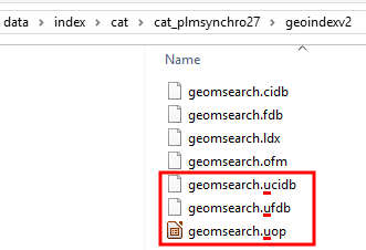 [38] Update files are created during a PLMsysnchro run. These are reintegrated into the main index depending on the setting at geomsearch.cfg -> Block [settings] -> Key MaxSizeOfUpdateList ). They are marked with a "u" in the file extension and can be found in the directory of the main index.