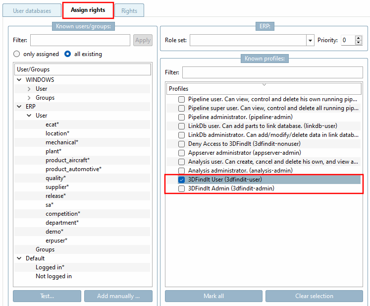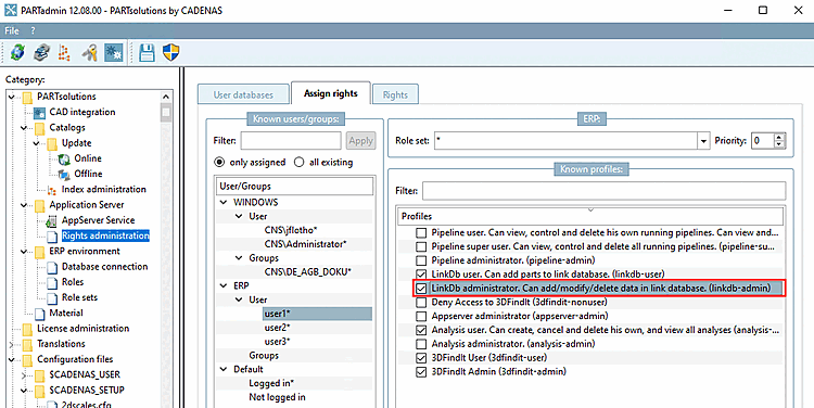 When using 3dfindit, at least 3Dfindit User must be activated in PARTadmin under Profiles for the authorized users and groups; otherwise there is no access to 3Dfindit.