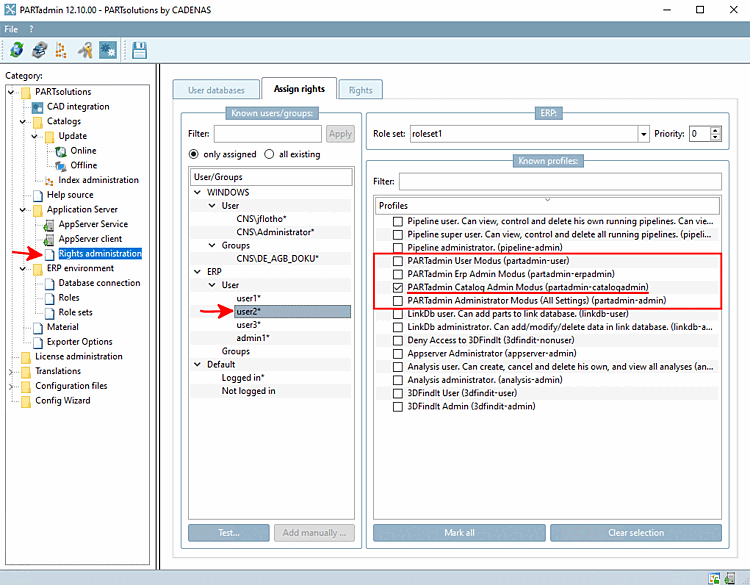 In a client-server environment, the tabbed page Rights assignment [Assign rights] also controls which categories are to be displayed in PARTadmin on clients in the Category dialog area.