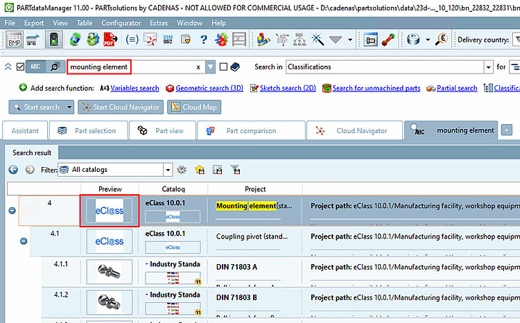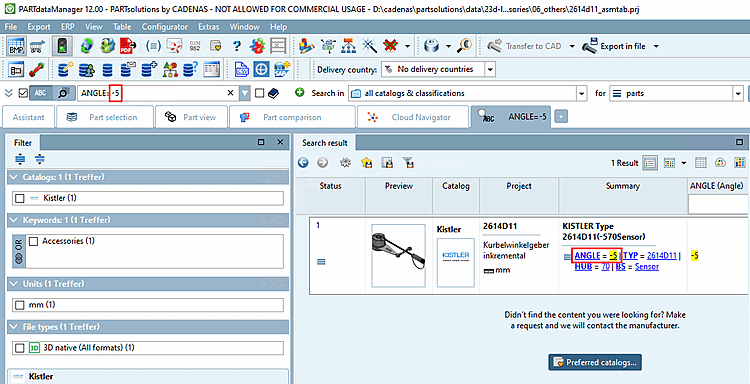A full-text search [Full-text search] not only searches table values, but also topological linear dimensions, which is particularly advantageous for own parts catalogs, as these often lack a detailed characteristic table.