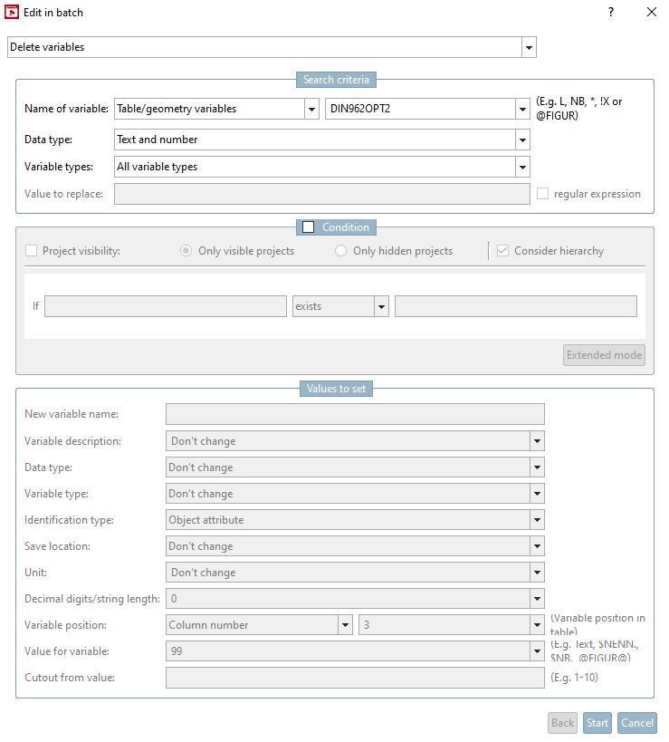 The attribute tables, assigned to the individual parts/projects of a catalog, can be modified via a batch run.