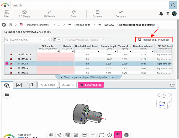 Initial situation: The desired part cannot be can be exported to CAD because the status indicator is red . This means that the user must, for example, standards body request that the part be included in the ERP/PDM system. becomes.