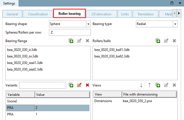 The individual components of a bearing, i.e. the *.3db files of the bearing rings [Bearing flange] and rollers/ball bearings [Rollers/balls], are combined in a rolling bearing project file.