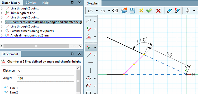 Chamfer between 2 lines, adjustable via angle on first selected line (counterclockwise) and length of chamfer.