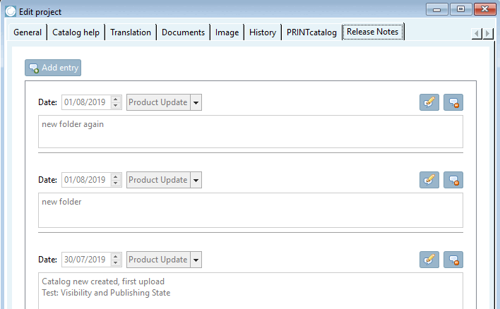 Enter the release notes [Release Notes] on the Release Notes tab page (only displayed at catalog level) before publishing.