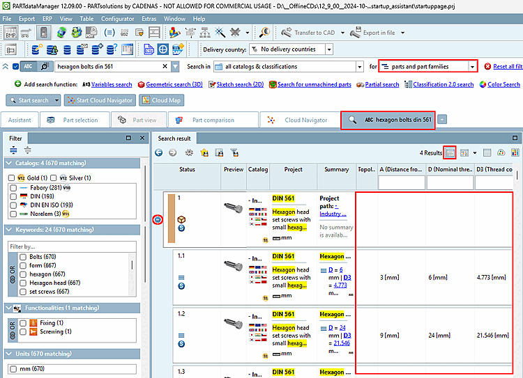 In the following example a search for "head cap bolt" and the numerical value "50" has been performed. Search terms are marked with yellow color.