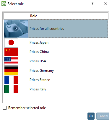 If several roles are provided for a user, the Select role dialog box opens when logging in. It can also be called up at any time using the Select group button