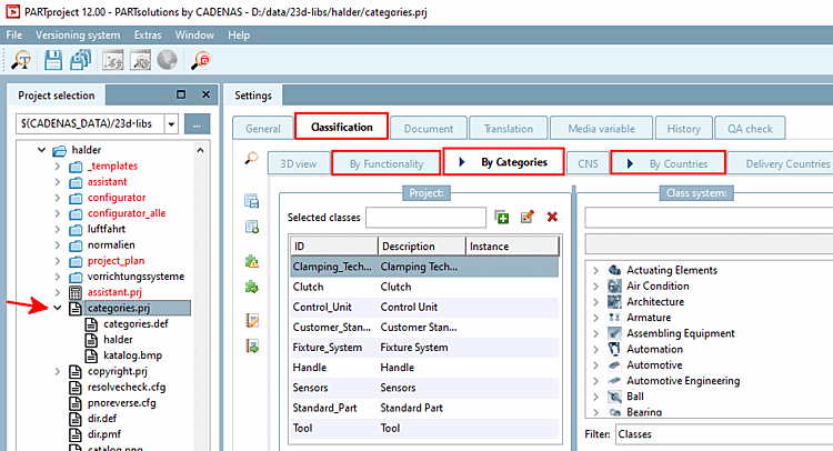 If the requirements are met, the By Categories, By Countries and By Functionality tabs are displayed in PARTproject after selecting the file categories.prj or a project file and the Classification tab below it, the By Categories, By Countries and By Functionality tabs are displayed.