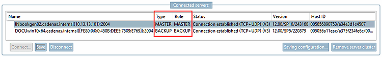 In the Connected servers dialog area, specific information is displayed for each server in the Type and Role columns.