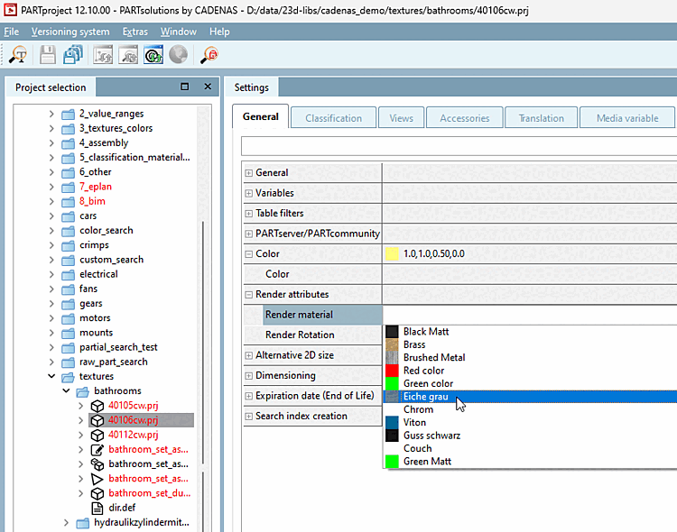 Under PARTproject → Edit project → Tabbed page General → Render properties [Render attributes] → Render material, select the render material for the selected component in the list field.