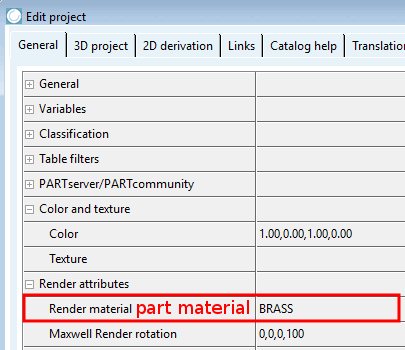 part material: ... indicates the setting in the matrix under Render properties [Render attributes] → Render material.
