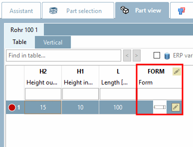 The prerequisite for this is that the relevant variable name is entered in PARTproject on the General tab page, in the Variables block under Variables with graphics [Variables containing graphics], the relevant variable name must be entered (here in the example FORM ).