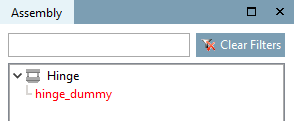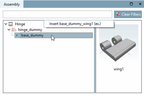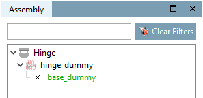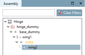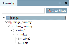 The assembly is shown as root element, below the dummy starter part and the pendent single parts.