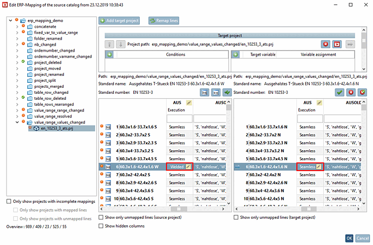 Initial situation: When changing a value range value, there is no adjustment in the right table.