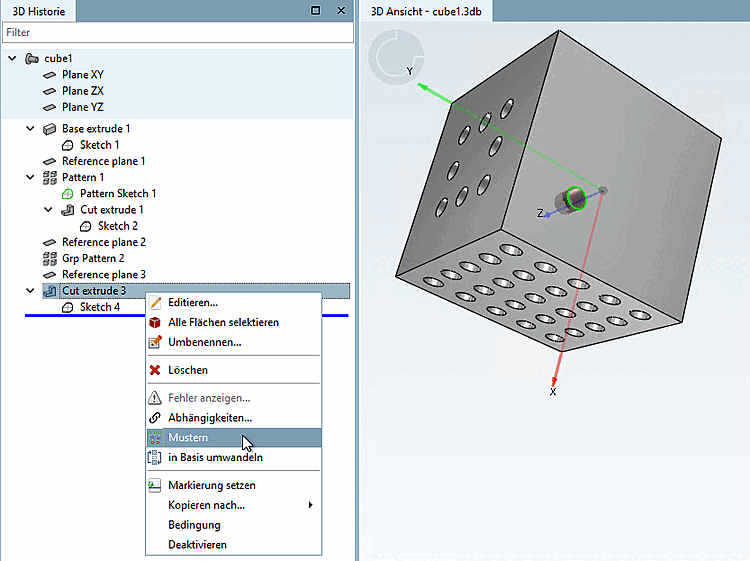 For patterns created using the wizard (Grp Pattern ), call up the wizard again using the Edit... context menu command. Manually created patterns can be edited using Edit... on the Pattern Sketch level.