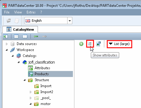 In the Table view type, all attribute names are listed one after the other in a single field. You can also perform a textual search of all products here. The total number of all products is displayed at the top right.