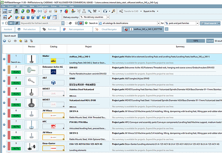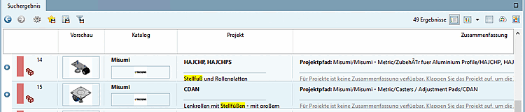 Since even components that can be used in the same way are not always designated with exactly the same term, a full-text search [Full-text search] with the search term "adjustable foot" excludes, for example, "machine feet", "articulated feet" or levelling feet, which might also come into question. In addition, untranslated foreign-language terms such as "articulated foot", "levelling foot", "mounting feet" cannot be found.