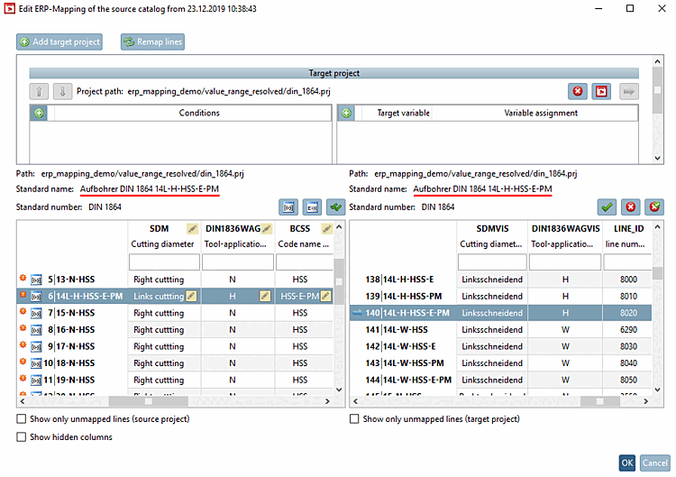 .-> The Edit value range assignments [Edit value range mappings] dialog box now opens with a list of all value combinations (the individual values separated by semicolons). At the end of each line is the LINE_ID separated by a colon.