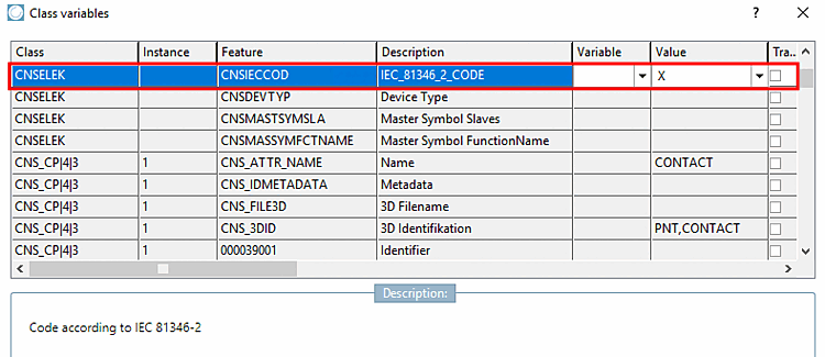 Set the corresponding value under class CNSELEK-> feature CNSIECCODwith the description IEC_81346_2_CODE.