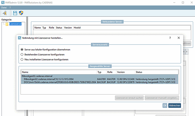 ... setup a Master-Backup cluster of license servers. Using a backup server is always recommended, in order to be able to go on working at a failure. In backup mode this is possible up to 12 hours. Even more secure is the usage of three license servers. In this way it is possible to work unlimited as long as two out of three are available.