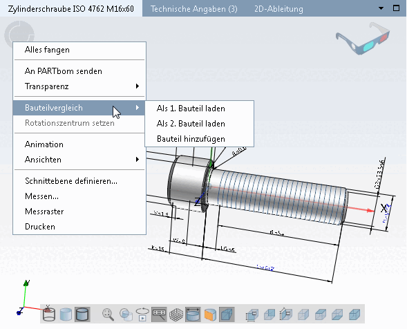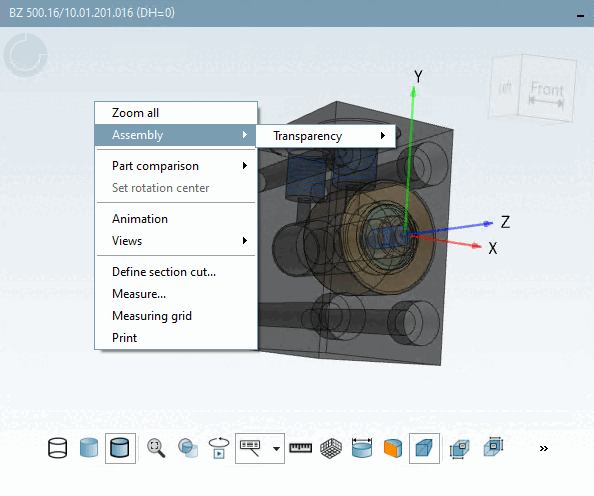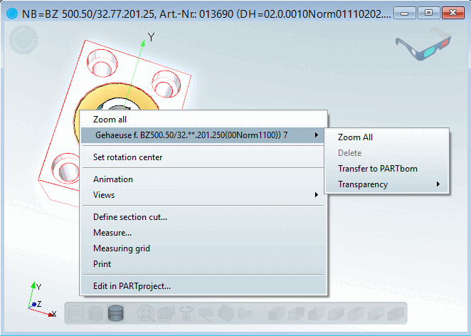 Opens a submenu with the functions Snap [Zoom], Delete, Send to PARTbom [Transfer to PARTbom], Transparency.