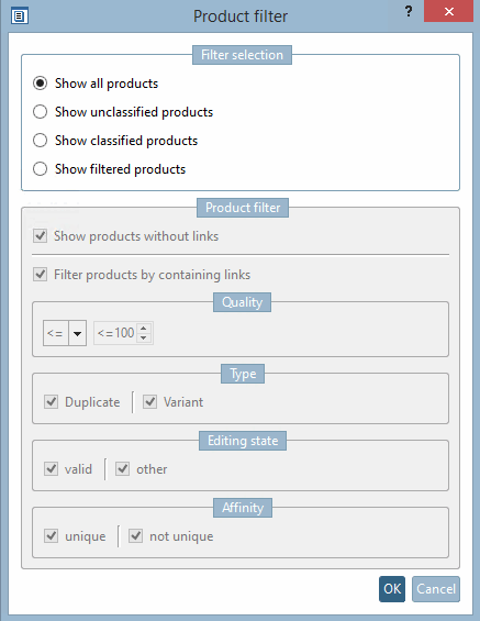 For filtering, you can use attributes of the link table such as product filter [Product filter], quality, type [Type], editing status [Editing state] or affiliation [Affinity] (see following figure) to further edit the remaining product links.