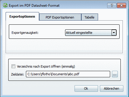 .-> The dialog box Export in PDF datasheet format opens onto the PDF export options tabbed page.