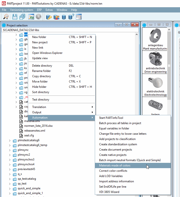 1. Call: PARTproject -> Project selection -> Catalog context menu -> Automation -> Set materials from colors