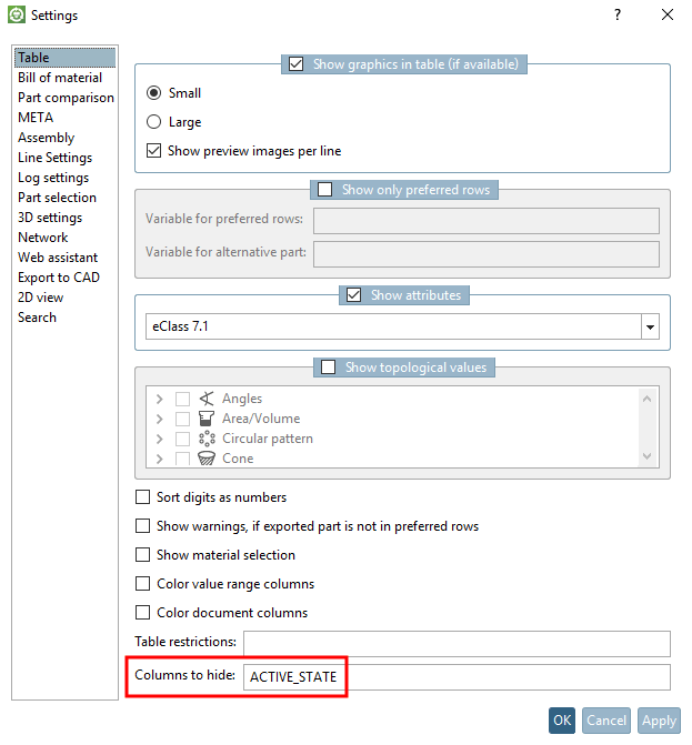 Certain settings in 3Dfindit are saved on the local workstation and can be changed by the user. This includes, for example, a list of columns to be suppressed.