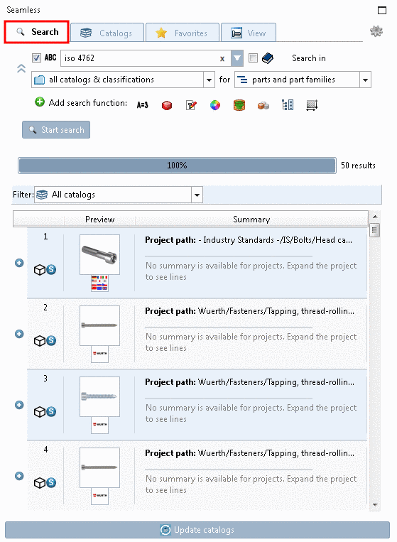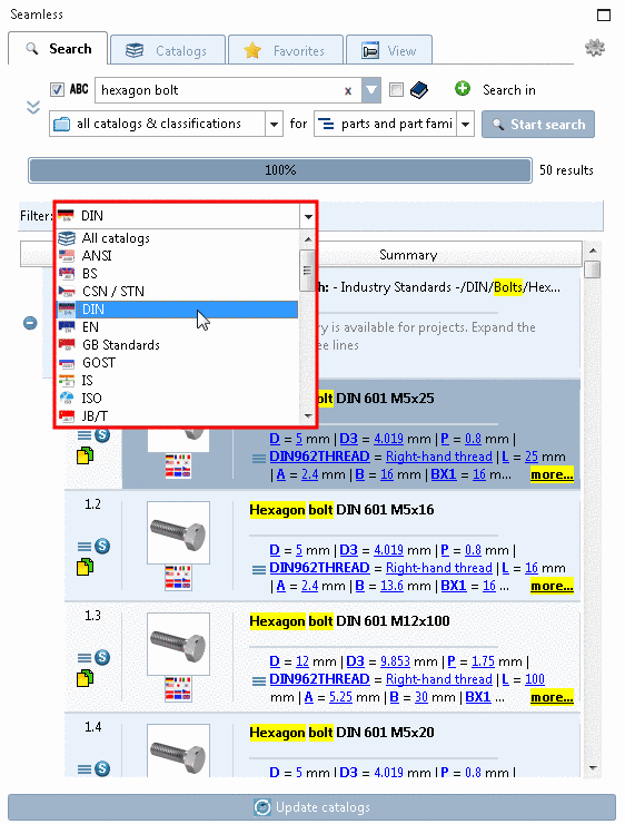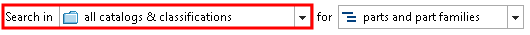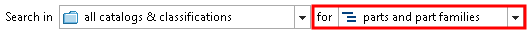 In this mode you can both access part families and characteristics within this. At first the result list is displayed compressed only with part families. However, when clicking on the