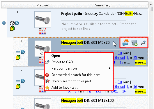 Save often needed parts as favorites. See also Section 2.6.5.3, “"Favorites" tabbed page”. The command is both available on the level of part families and on the level of parts. |