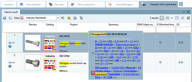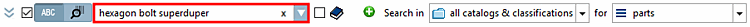 Don't forget to search for part families and individual parts [parts and part families] this time. The search term "hexagon head screw" would unnecessarily produce a huge number of hits. | |